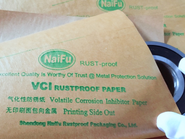 4、包裝過程---將含有緩蝕劑的面朝向金屬包裝,不覆膜防銹紙可作為金屬產(chǎn)品間墊層隔材使用,以免其他材質阻隔材料含S、CL化學成分,影響防銹效果